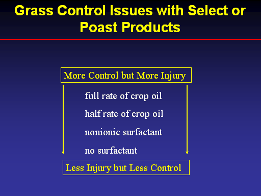 Grass Control Issues with Select or Poast Products<BR>full rate of crop oil <BR>half rate of crop oil <BR>nonionic surfactant <BR>no surfactant<BR>More Control but More Injury<BR>Less Injury but Less Control<BR>