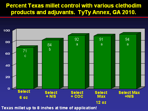 Percent Texas millet control with various clethodim products and adjuvants.  TyTy Annex, GA 2010.<BR>84 b<BR>71 c<BR>92 a<BR>Select Max <BR>12 oz<BR>Select <BR>6 oz<BR>Select Max     +NIS<BR>Select + NIS<BR>Select + COC<BR>91 a<BR>94 a<BR>Texas millet up to 8 inches at time of application!<BR>