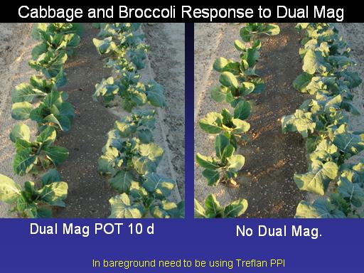 Dual Mag POT 10 d<BR>No Dual Mag.<BR>Cabbage and Broccoli Response to Dual Mag<BR>In bareground need to be using Treflan PPI <BR>