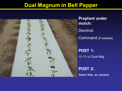 Dual Magnum in Bell Pepper<BR>Preplant under mulch:  <BR>Devrinol <BR>Command (if needed) <BR> <BR>POST 1:  <BR>10-12 oz Dual Mag <BR> <BR>POST 2: <BR>Select Max as needed<BR>