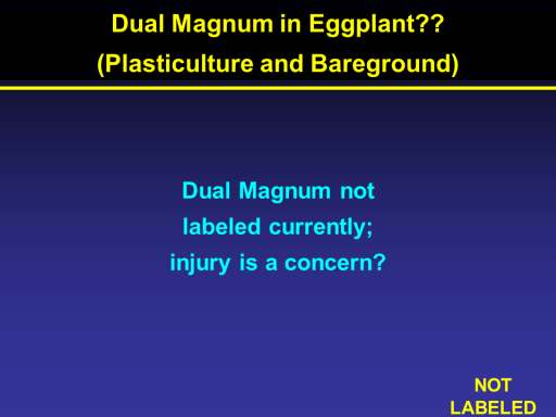 Dual Magnum in Eggplant?? <BR>(Plasticulture and Bareground)<BR>NOT LABELED<BR>Dual Magnum not <BR>labeled currently;  <BR>injury is a concern?<BR>