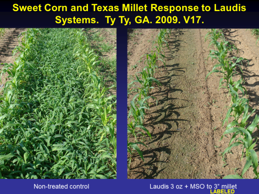 Sweet Corn and Texas Millet Response to Laudis Systems.  Ty Ty, GA. 2009. V17.<BR>Non-treated control<BR>Laudis 3 oz + MSO to 3” millet<BR>LABELED<BR>