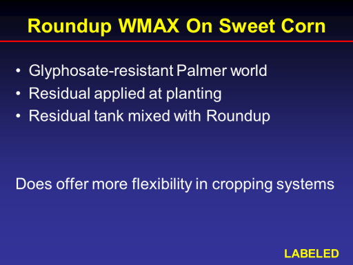Roundup WMAX On Sweet Corn<BR>Glyphosate-resistant Palmer world <BR>Residual applied at planting  <BR>Residual tank mixed with Roundup <BR> <BR> <BR>Does offer more flexibility in cropping systems<BR>LABELED<BR>