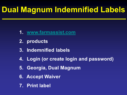 Dual Magnum Indemnified Labels <BR>  www.farmassist.com <BR>  products <BR>  Indemnified labels <BR>  Login (or create login and password) <BR>  Georgia, Dual Magnum <BR>  Accept Waiver <BR>  Print label<BR>