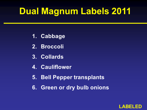 Dual Magnum Labels 2011 <BR>  Cabbage <BR>  Broccoli <BR>  Collards <BR>  Cauliflower <BR>  Bell Pepper transplants <BR>  Green or dry bulb onions<BR>LABELED<BR>
