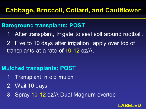<BR>Bareground transplants: POST <BR>	1.  After transplant, irrigate to seal soil around rootball. <BR>	2.  Five to 10 days after irrigation, apply over top of transplants at a rate of 10-12 oz/A. <BR> <BR>Mulched transplants: POST <BR>	1.  Transplant in old mulch <BR>	2.  Wait 10 days <BR>	3.  Spray 10-12 oz/A Dual Magnum overtop <BR>Cabbage, Broccoli, Collard, and Cauliflower<BR>LABELED<BR>