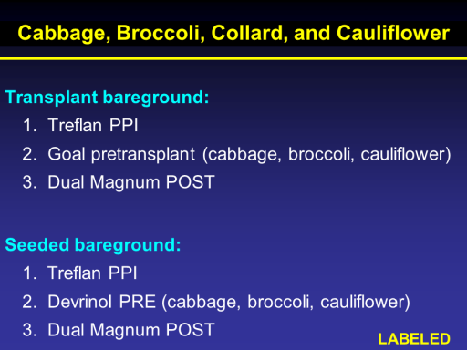 <BR>Transplant bareground: <BR>	1.  Treflan PPI <BR>	2.  Goal pretransplant (cabbage, broccoli, cauliflower) <BR>	3.  Dual Magnum POST<BR>Cabbage, Broccoli, Collard, and Cauliflower<BR>  <BR>Seeded bareground: <BR>	1.  Treflan PPI <BR>	2.  Devrinol PRE (cabbage, broccoli, cauliflower) <BR>	3.  Dual Magnum POST<BR>LABELED<BR>
