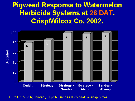 Pigweed Response to Watermelon Herbicide Systems at 26 DAT.  Crisp/Wilcox Co. 2002.<BR>Curbit, 1.5 pt/A; Strategy, 3 pt/A; Sandea 0.75 oz/A; Alanap 5 qt/A.<BR>
