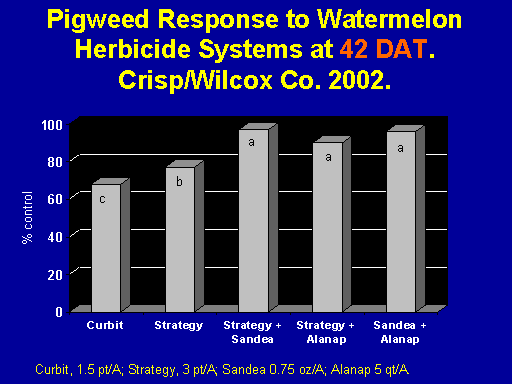 Pigweed Response to Watermelon Herbicide Systems at 42 DAT.  Crisp/Wilcox Co. 2002.<BR>Curbit, 1.5 pt/A; Strategy, 3 pt/A; Sandea 0.75 oz/A; Alanap 5 qt/A.<BR>% control<BR>c<BR>b<BR>a<BR>a<BR>a<BR>