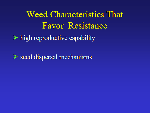 Weed Characteristics That  Favor  Resistance<BR> high reproductive capability <BR> <BR> seed dispersal mechanisms<BR>
