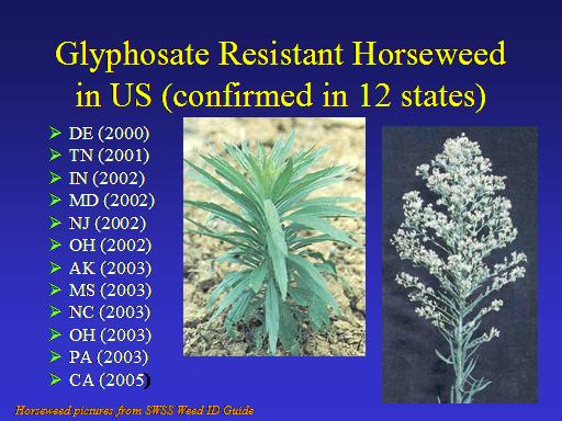 Glyphosate Resistant Horseweed in US (confirmed in 12 states)<BR>DE (2000) <BR>TN (2001) <BR>IN (2002) <BR>MD (2002) <BR>NJ (2002) <BR>OH (2002) <BR>AK (2003) <BR>MS (2003) <BR>NC (2003) <BR>OH (2003) <BR>PA (2003) <BR>CA (2005)<BR>Horseweed pictures from SWSS Weed ID Guide<BR>