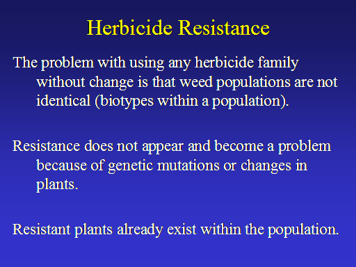 Herbicide Resistance<BR>The problem with using any herbicide family  without change is that weed populations are not identical (biotypes within a population). <BR> <BR>Resistance does not appear and become a problem because of genetic mutations or changes in plants. <BR> <BR>Resistant plants already exist within the population.<BR>