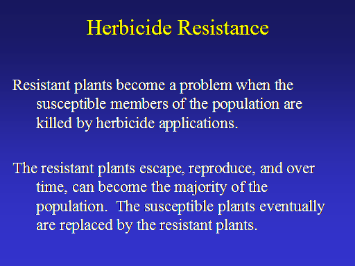 Herbicide Resistance<BR> <BR>Resistant plants become a problem when the susceptible members of the population are killed by herbicide applications. <BR> <BR>The resistant plants escape, reproduce, and over time, can become the majority of the population.  The susceptible plants eventually are replaced by the resistant plants.<BR>
