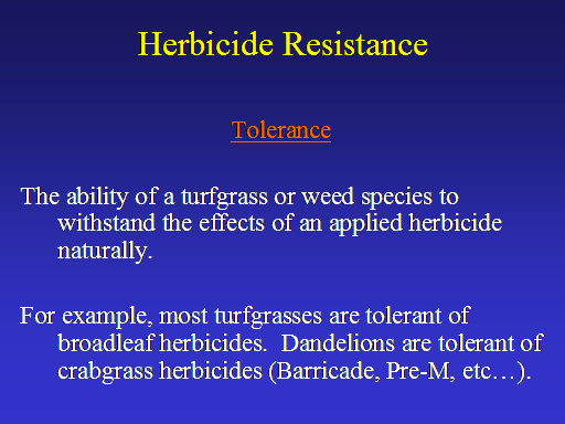 Herbicide Resistance<BR> <BR>Tolerance <BR> <BR>The ability of a turfgrass or weed species to withstand the effects of an applied herbicide naturally. <BR> <BR>For example, most turfgrasses are tolerant of broadleaf herbicides.  Dandelions are tolerant of crabgrass herbicides (Barricade, Pre-M, etc…).<BR>