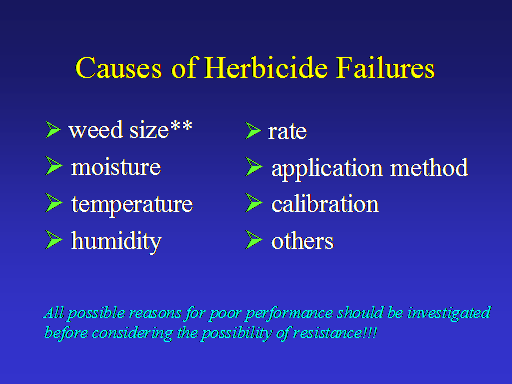Causes of Herbicide Failures<BR> weed size** <BR> moisture <BR> temperature <BR> humidity <BR> rate <BR> application method <BR> calibration <BR> others <BR>All possible reasons for poor performance should be investigated <BR>before considering the possibility of resistance!!!<BR>