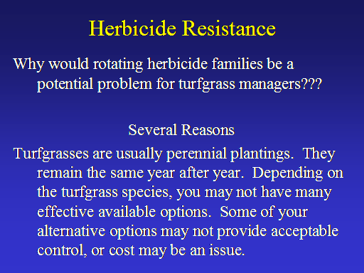 Herbicide Resistance<BR>Why would rotating herbicide families be a potential problem for turfgrass managers??? <BR> <BR>Several Reasons <BR>Turfgrasses are usually perennial plantings.  They remain the same year after year.  Depending on the turfgrass species, you may not have many effective available options.  Some of your alternative options may not provide acceptable control, or cost may be an issue.<BR>