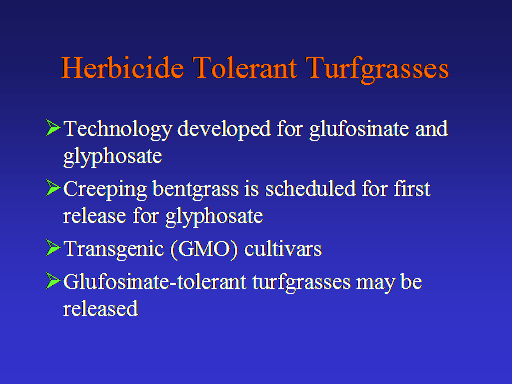 Herbicide Tolerant Turfgrasses<BR>Technology developed for glufosinate and glyphosate <BR>Creeping bentgrass is scheduled for first release for glyphosate <BR>Transgenic (GMO) cultivars <BR>Glufosinate-tolerant turfgrasses may be released<BR>