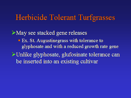 Herbicide Tolerant Turfgrasses<BR>May see stacked gene releases <BR>Ex. St. Augustinegrass with tolerance to glyphosate and with a reduced growth rate gene <BR>Unlike glyphosate, glufosinate tolerance can be inserted into an existing cultivar<BR>