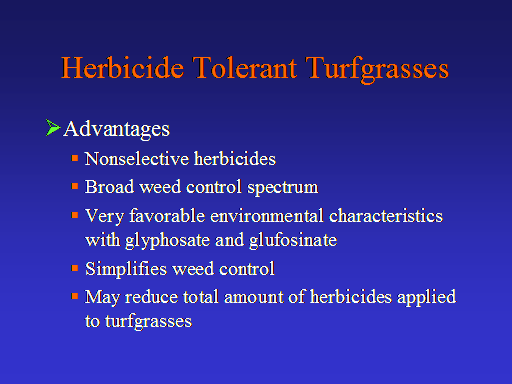 Herbicide Tolerant Turfgrasses<BR>Advantages <BR>Nonselective herbicides <BR>Broad weed control spectrum <BR>Very favorable environmental characteristics with glyphosate and glufosinate <BR>Simplifies weed control <BR>May reduce total amount of herbicides applied to turfgrasses <BR> <BR>