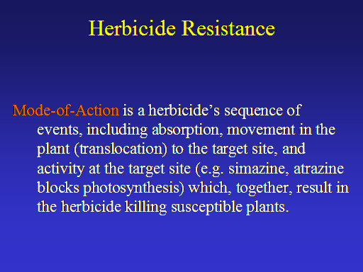 Herbicide Resistance<BR> <BR> <BR>Mode-of-Action is a herbicide’s sequence of events, including absorption, movement in the plant (translocation) to the target site, and activity at the target site (e.g. simazine, atrazine blocks photosynthesis) which, together, result in the herbicide killing susceptible plants.<BR>