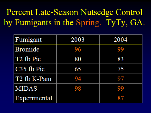 Percent Late-Season Nutsedge Control by Fumigants in the Spring.  TyTy, GA. <BR>