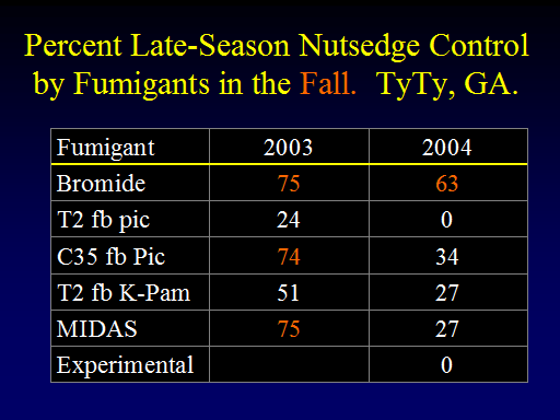 Percent Late-Season Nutsedge Control by Fumigants in the Fall.  TyTy, GA. <BR>