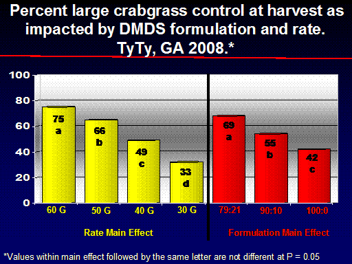 Percent large crabgrass control at harvest as impacted by DMDS formulation and rate.  TyTy, GA 2008.*<BR>50 G<BR>30 G<BR>90:10<BR>100:0<BR>40 G<BR>55 b<BR>Rate Main Effect<BR>75 a<BR>66 b<BR>49 c<BR>69 a<BR>42 c<BR>Formulation Main Effect<BR>60 G <BR>79:21 <BR>*Values within main effect followed by the same letter are not different at P = 0.05<BR>33 d<BR>