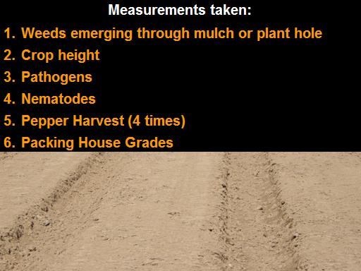 Measurements taken: <BR> Weeds emerging through mulch or plant hole <BR> Crop height <BR> Pathogens <BR> Nematodes <BR> Pepper Harvest (4 times) <BR> Packing House Grades<BR>