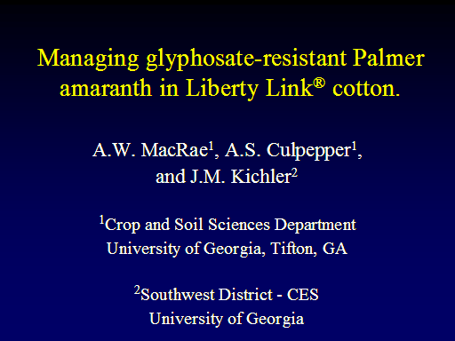Managing glyphosate-resistant Palmer amaranth in Liberty LinkŪ cotton. <BR>A.W. MacRae1, A.S. Culpepper1,  <BR>and J.M. Kichler2 <BR> <BR>1Crop and Soil Sciences Department <BR>University of Georgia, Tifton, GA <BR> <BR>2Southwest District - CES <BR>University of Georgia<BR>