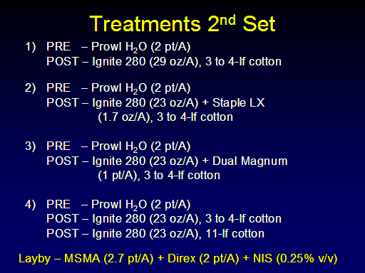 Treatments 2nd Set<BR>PRE   – Prowl H2O (2 pt/A) <BR>	POST – Ignite 280 (29 oz/A), 3 to 4-lf cotton <BR> <BR>PRE   – Prowl H2O (2 pt/A) <BR>	POST – Ignite 280 (23 oz/A) + Staple LX  <BR>			(1.7 oz/A), 3 to 4-lf cotton <BR>	 <BR>PRE   – Prowl H2O (2 pt/A) <BR>	POST – Ignite 280 (23 oz/A) + Dual Magnum <BR>			(1 pt/A), 3 to 4-lf cotton <BR> <BR>4)	PRE   – Prowl H2O (2 pt/A) <BR>	POST – Ignite 280 (23 oz/A), 3 to 4-lf cotton <BR>	POST – Ignite 280 (23 oz/A), 11-lf cotton<BR>Layby – MSMA (2.7 pt/A) + Direx (2 pt/A) + NIS (0.25% v/v)<BR>
