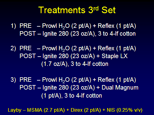 Treatments 3rd Set<BR>PRE   – Prowl H2O (2 pt/A) + Reflex (1 pt/A) <BR>	POST – Ignite 280 (23 oz/A), 3 to 4-lf cotton <BR> <BR>PRE   – Prowl H2O (2 pt/A) + Reflex (1 pt/A) <BR>	POST – Ignite 280 (23 oz/A) + Staple LX  <BR>			(1.7 oz/A), 3 to 4-lf cotton <BR>	 <BR>PRE   – Prowl H2O (2 pt/A) + Reflex (1 pt/A) <BR>	POST – Ignite 280 (23 oz/A) + Dual Magnum <BR>			(1 pt/A), 3 to 4-lf cotton<BR>Layby – MSMA (2.7 pt/A) + Direx (2 pt/A) + NIS (0.25% v/v)<BR>