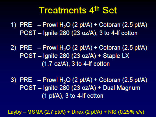 Treatments 4th Set<BR>PRE   – Prowl H2O (2 pt/A) + Cotoran (2.5 pt/A) <BR>	POST – Ignite 280 (23 oz/A), 3 to 4-lf cotton <BR> <BR>PRE   – Prowl H2O (2 pt/A) + Cotoran (2.5 pt/A) <BR>	POST – Ignite 280 (23 oz/A) + Staple LX  <BR>			(1.7 oz/A), 3 to 4-lf cotton <BR>	 <BR>PRE   – Prowl H2O (2 pt/A) + Cotoran (2.5 pt/A) <BR>	POST – Ignite 280 (23 oz/A) + Dual Magnum <BR>			(1 pt/A), 3 to 4-lf cotton<BR>Layby – MSMA (2.7 pt/A) + Direx (2 pt/A) + NIS (0.25% v/v)<BR>