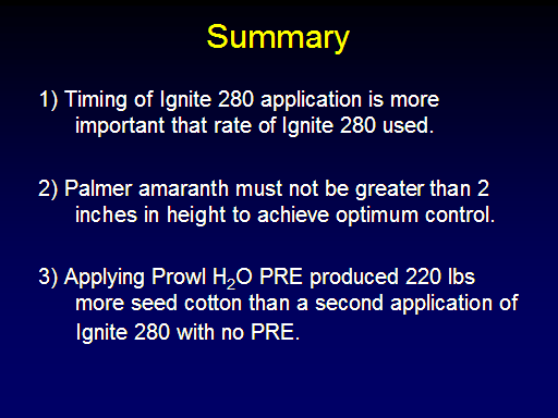Summary<BR>1) Timing of Ignite 280 application is more important that rate of Ignite 280 used.   <BR> <BR>2) Palmer amaranth must not be greater than 2 inches in height to achieve optimum control. <BR>   <BR>3) Applying Prowl H2O PRE produced 220 lbs more seed cotton than a second application of Ignite 280 with no PRE.   <BR>