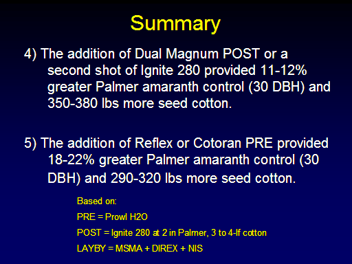 Summary<BR>4) The addition of Dual Magnum POST or a second shot of Ignite 280 provided 11-12% greater Palmer amaranth control (30 DBH) and 350-380 lbs more seed cotton.  <BR>  <BR>5) The addition of Reflex or Cotoran PRE provided 18-22% greater Palmer amaranth control (30 DBH) and 290-320 lbs more seed cotton.  <BR>Based on: <BR>PRE = Prowl H2O <BR>POST = Ignite 280 at 2 in Palmer, 3 to 4-lf cotton <BR>LAYBY = MSMA + DIREX + NIS <BR>