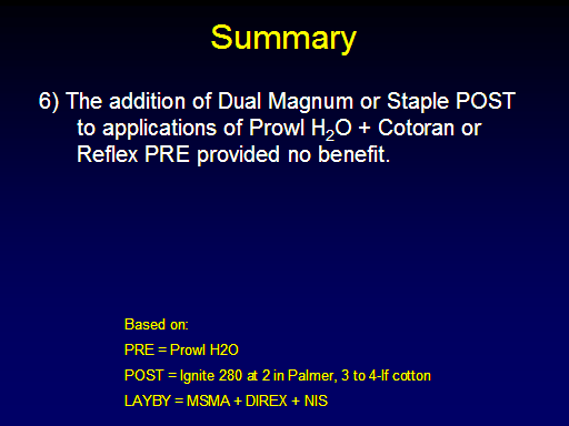 Summary<BR>6) The addition of Dual Magnum or Staple POST to applications of Prowl H2O + Cotoran or Reflex PRE provided no benefit. <BR>Based on: <BR>PRE = Prowl H2O <BR>POST = Ignite 280 at 2 in Palmer, 3 to 4-lf cotton <BR>LAYBY = MSMA + DIREX + NIS <BR>