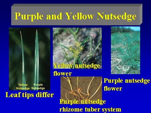 Purple and Yellow Nutsedge<BR>Leaf tips differ<BR>Yellow nutsedge flower<BR>Purple nutsedge flower<BR>Purple nutsedge rhizome tuber system<BR>