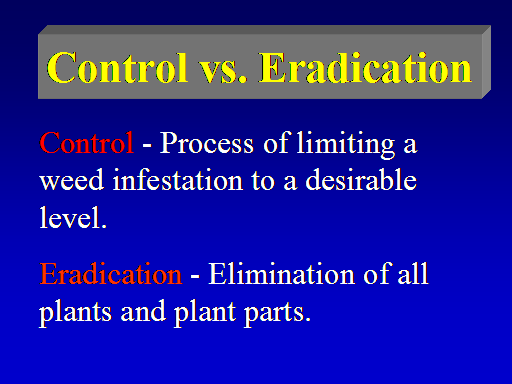 Control vs. Eradication<BR>Control - Process of limiting a weed infestation to a desirable level.