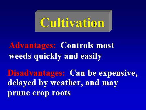 Cultivation<BR>Disadvantages:  Can be expensive, delayed by weather, and may prune crop roots<BR>Advantages:  Controls most weeds quickly and easily<BR>