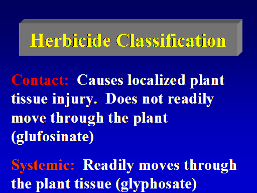 Herbicide Classification<BR>Contact:  Causes localized plant tissue injury.  Does not readily move through the plant (glufosinate)