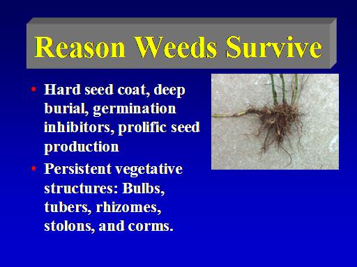 Reason Weeds Survive<BR>Hard seed coat, deep burial, germination inhibitors, prolific seed production