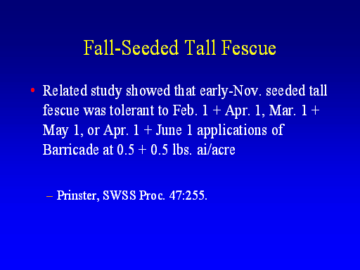 <LI><H2>Related study showed that early-Nov. seeded tall fescue was tolerant to Feb. 1 + Apr. 1, Mar. 1 + May 1, or Apr. 1 + June 1 applications of Barricade at 0.5 + 0.5 lbs. ai/acre