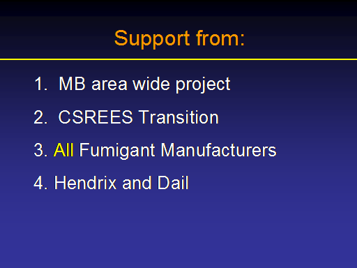 Support from: <BR>  <BR>1.  MB area wide project <BR>2.  CSREES Transition <BR> All Fumigant Manufacturers <BR> Hendrix and Dail<BR>