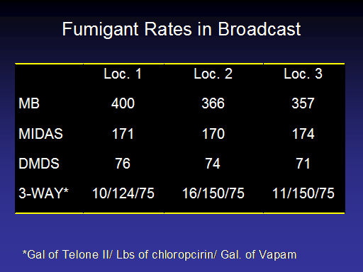 Fumigant Rates in Broadcast<BR>*Gal of Telone II/ Lbs of chloropcirin/ Gal. of Vapam<BR>