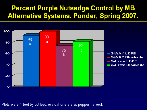 Percent Purple Nutsedge Control by MB Alternative Systems. Ponder, Spring 2007.<BR>Plots were 1 bed by 50 feet, evaluations are at pepper harvest.  <BR>93 a<BR>99a<BR>75b<BR>82 b<BR>