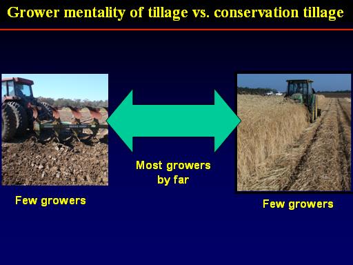 Few growers<BR>Few growers<BR>Most growers by far<BR>Grower mentality of tillage vs. conservation tillage<BR>