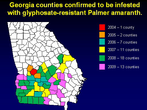Georgia counties confirmed to be infested with glyphosate-resistant Palmer amaranth.<BR>2004 – 1 county<BR>2005 – 2 counties<BR>2006 – 7 counties<BR>2007 – 11 counties<BR>2008 – 18 counties<BR>2009 – 13 counties<BR>