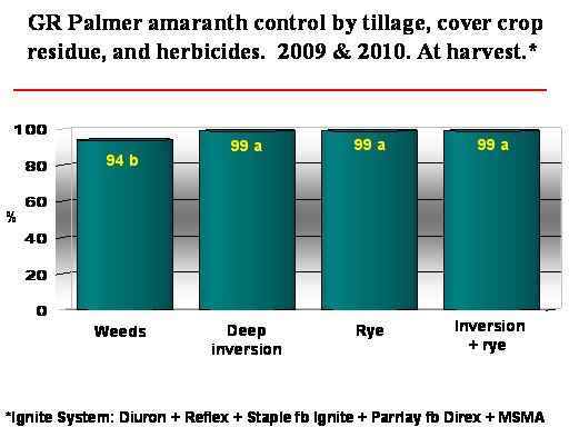 GR Palmer amaranth control by tillage, cover crop residue, and herbicides.  2009 & 2010. At harvest.*<BR>99 a<BR>99 a<BR>Weeds<BR>*Ignite System: Diuron + Reflex + Staple fb Ignite + Parrlay fb Direx + MSMA<BR> Inversion + rye<BR>Deep inversion<BR>99 a<BR>Rye<BR>%<BR>94 b<BR>