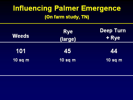 Influencing Palmer Emergence <BR>(On farm study, TN)<BR>Weeds<BR>Rye  <BR>(large)<BR>Deep Turn  <BR>+ Rye<BR> <BR>101 <BR>10 sq m<BR>45 <BR>10 sq m<BR>44 <BR>10 sq m<BR>