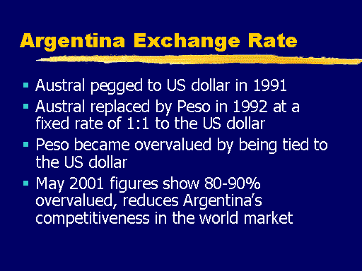 <BR>May 2001 figures show 80-90% overvalued, reduces Argentina’s competitiveness in the world market <BR>