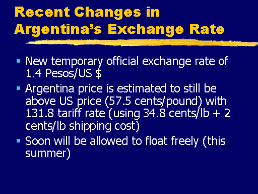 <BR>Argentina price is estimated to still be above US price (57.5 cents/pound) with 131.8 tariff rate (using 34.8 cents/lb + 2 cents/lb shipping cost)